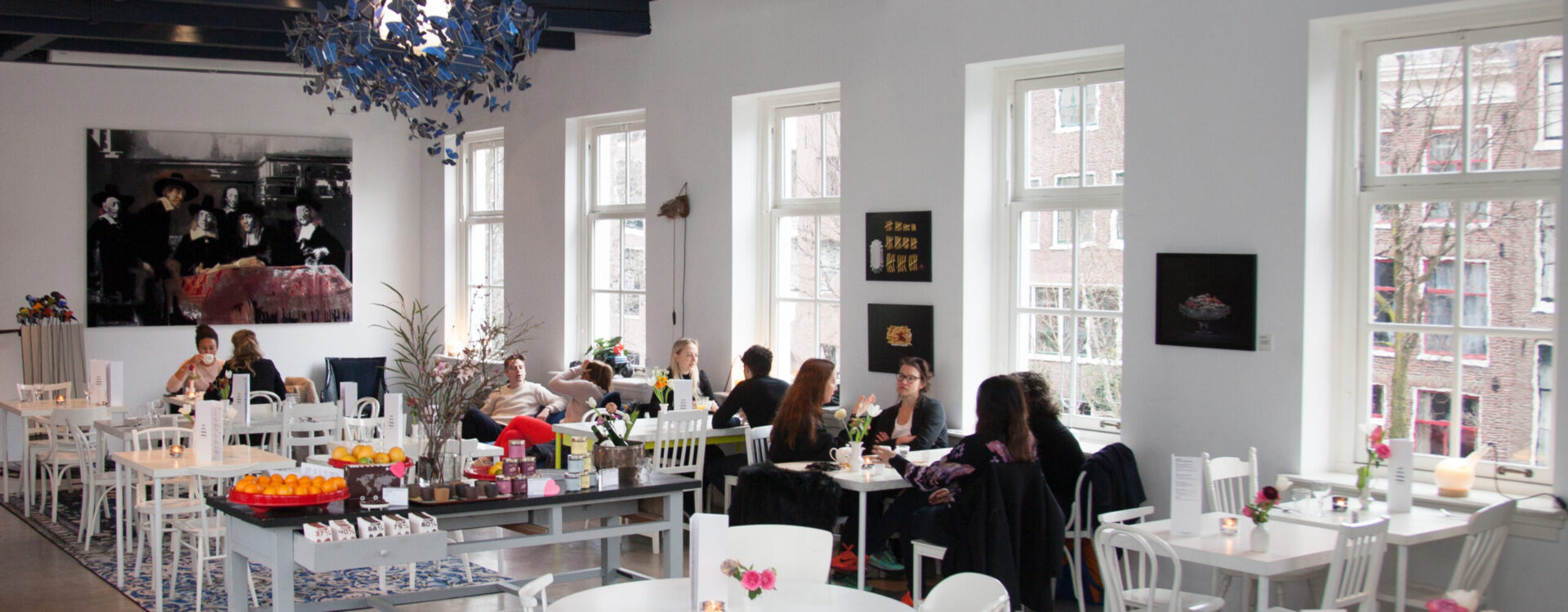 The cafe@droog is open everyday from 10-5 for coffee and cakes, breakfast, lunch, drinks and bites. You can eat and drink in an elegant and airy space that overlooks the canal and our Fairytale Garden. Enjoy homemade recipes based on one philosophy—fresh and delicious.