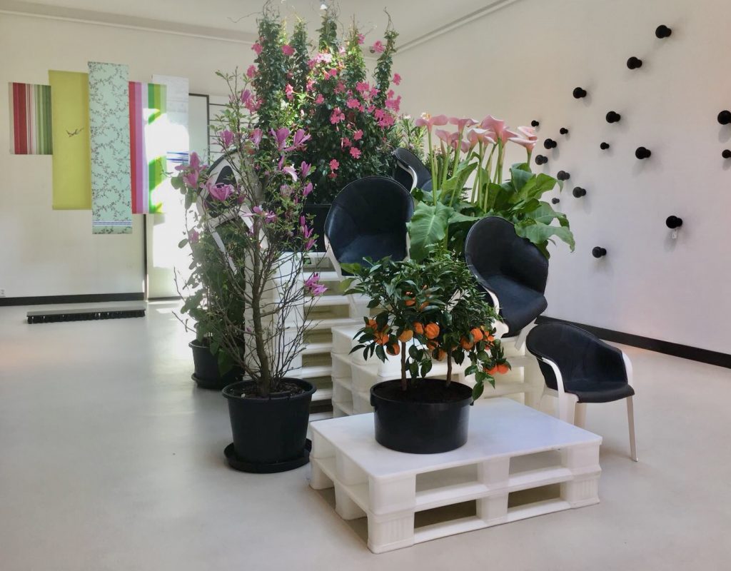In the piece, the relationship between nature and culture is investigated though an intervention with black and white objects. You are most likely to find garden chairs, plastic pallets and somewhere a blackbird singing the melody of the season.