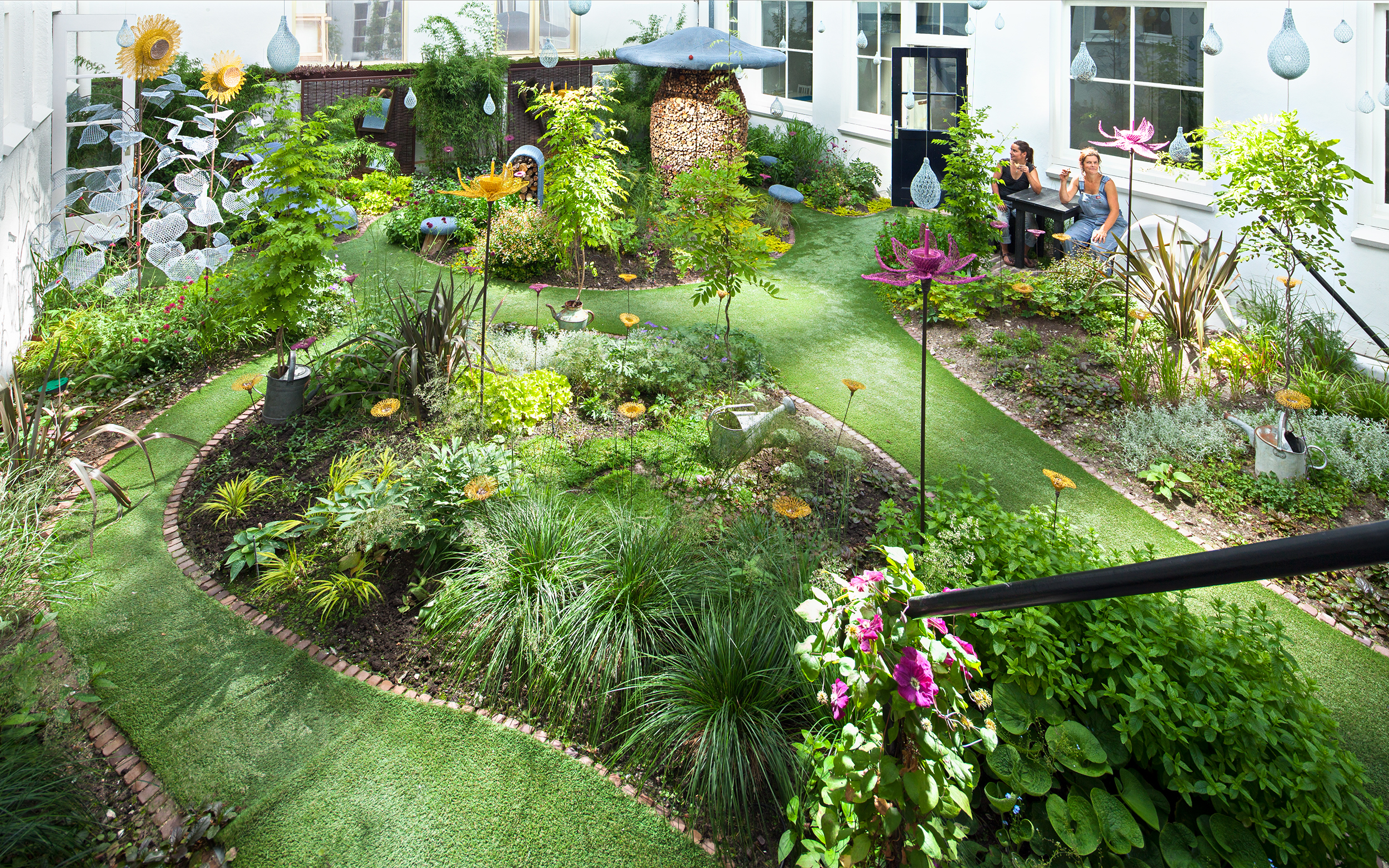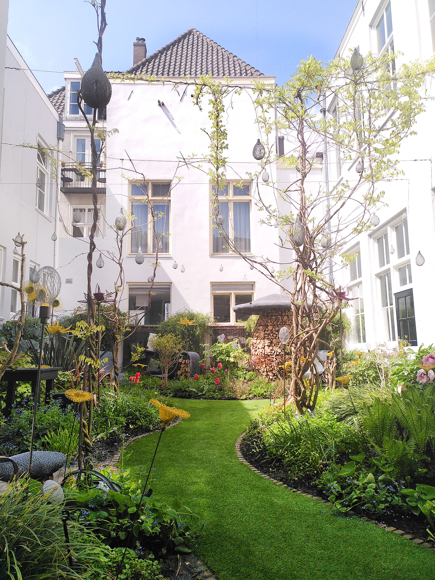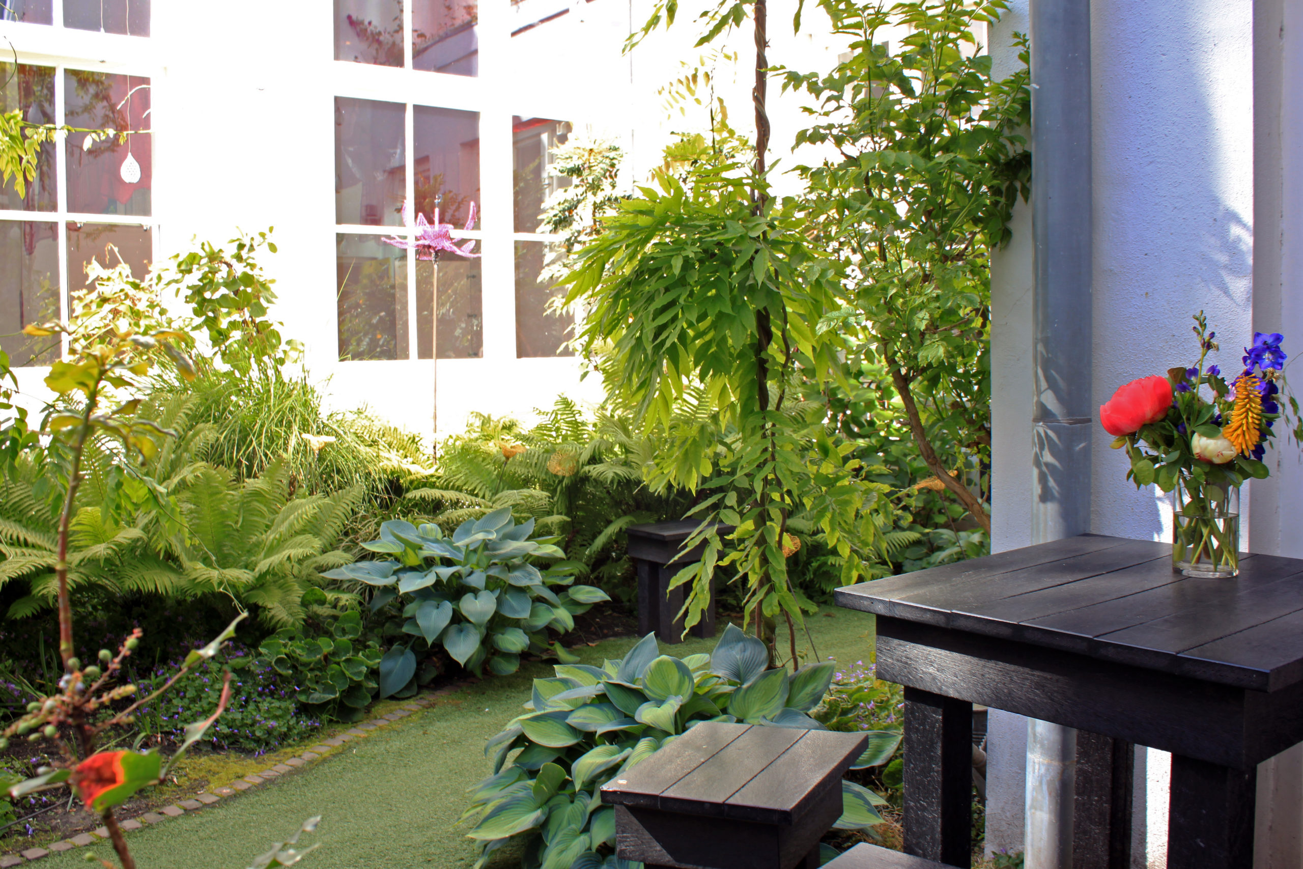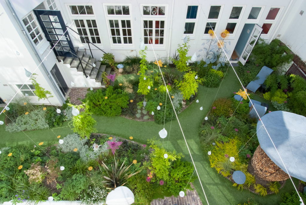 Immerse yourself in the peaceful oasis of the Fairytale Garden. Designed by French designers Claude Pasquer and Corinne Détroyat, the @droog courtyard has been transformed into a haven for biodiversity, where natural and artificial elements interlace. All elements are functional, attracting, feeding, watering, and providing shelter for birds, butterflies, insects, flowers, edible plants, and humans alike. Mixing seamlessly with an abundance of plants, the synthetic grass covers the winding pathways to create a sense of stillness, all the while transporting the visitor to a fairy tale landscape. The garden is a beautiful place to stretch your legs, breathe in fresh air, and enjoy a drink in the sun.