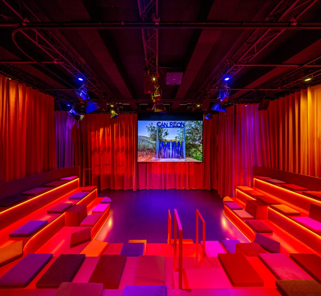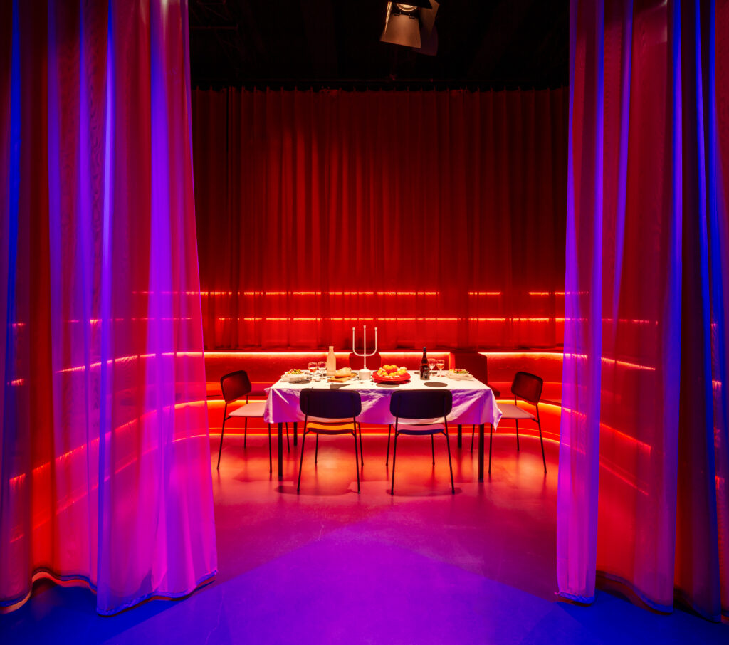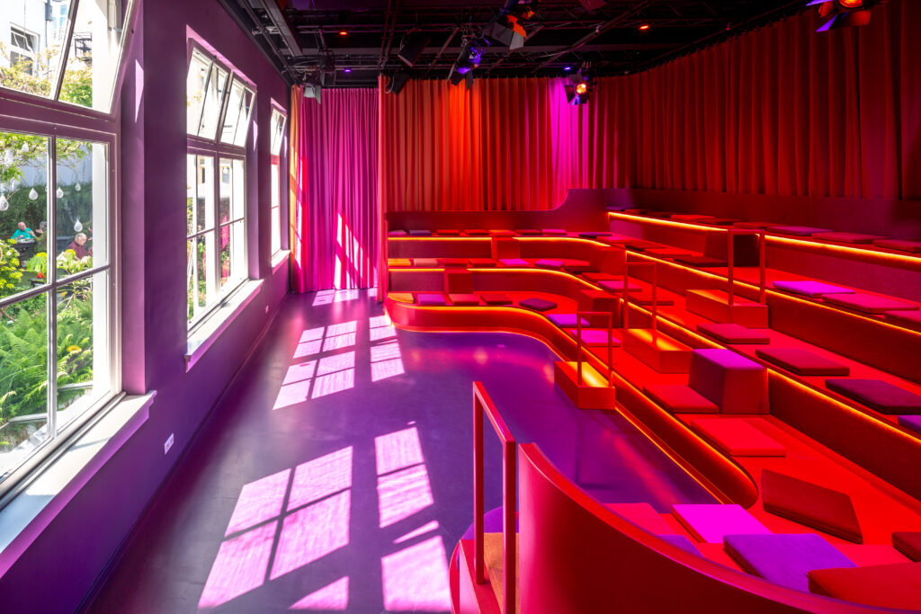 Step into the newly renovated Red Space: a captivating 75 sqm room designed by Edith Gruson, where soft textures and a layered atmosphere bring her unique vision to life. With deep purple walls and a flowing composition of orange and pink curtains cascading from ceiling to floor, the Red Space evokes the intimacy of a small historic theatre.